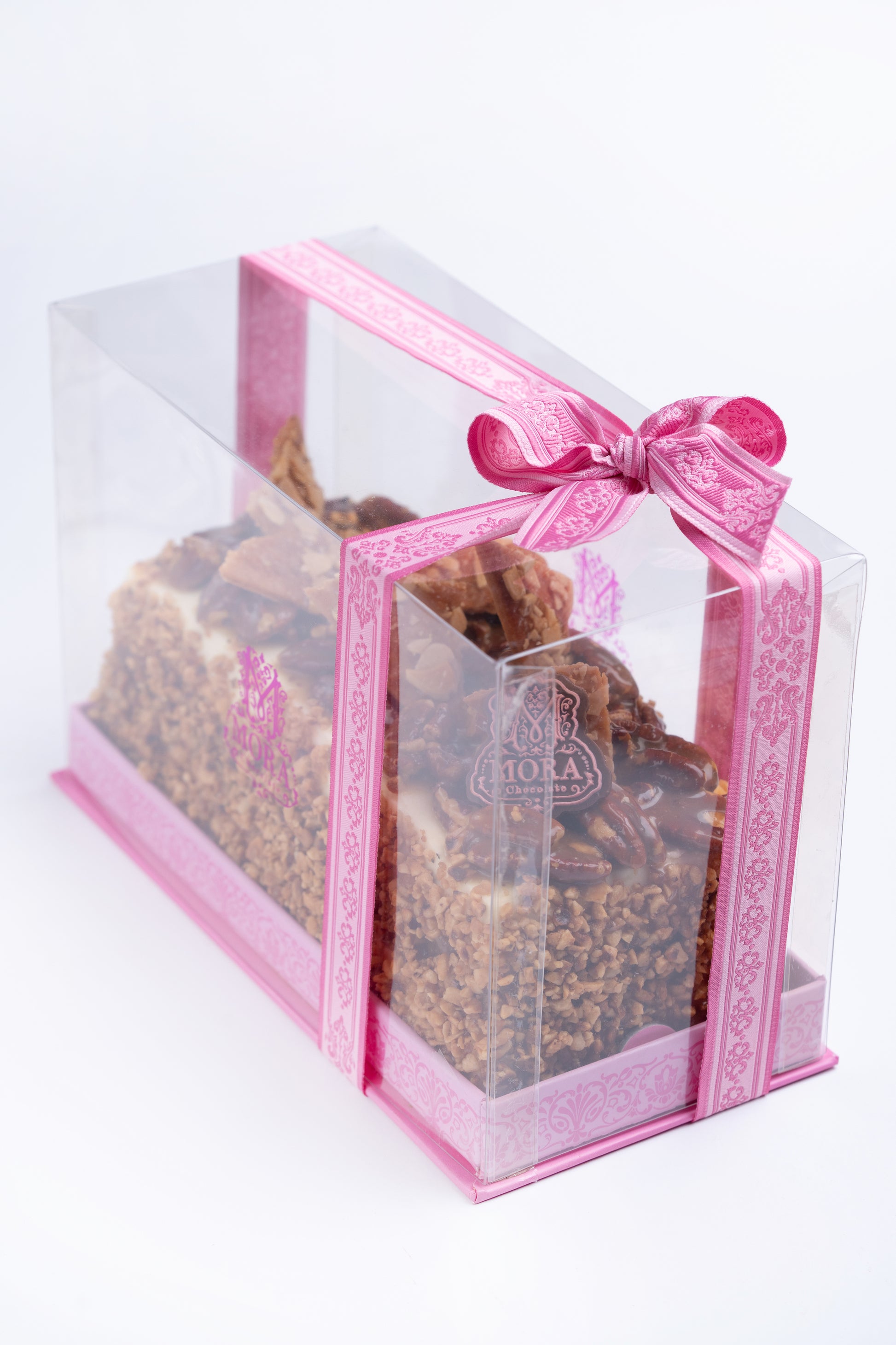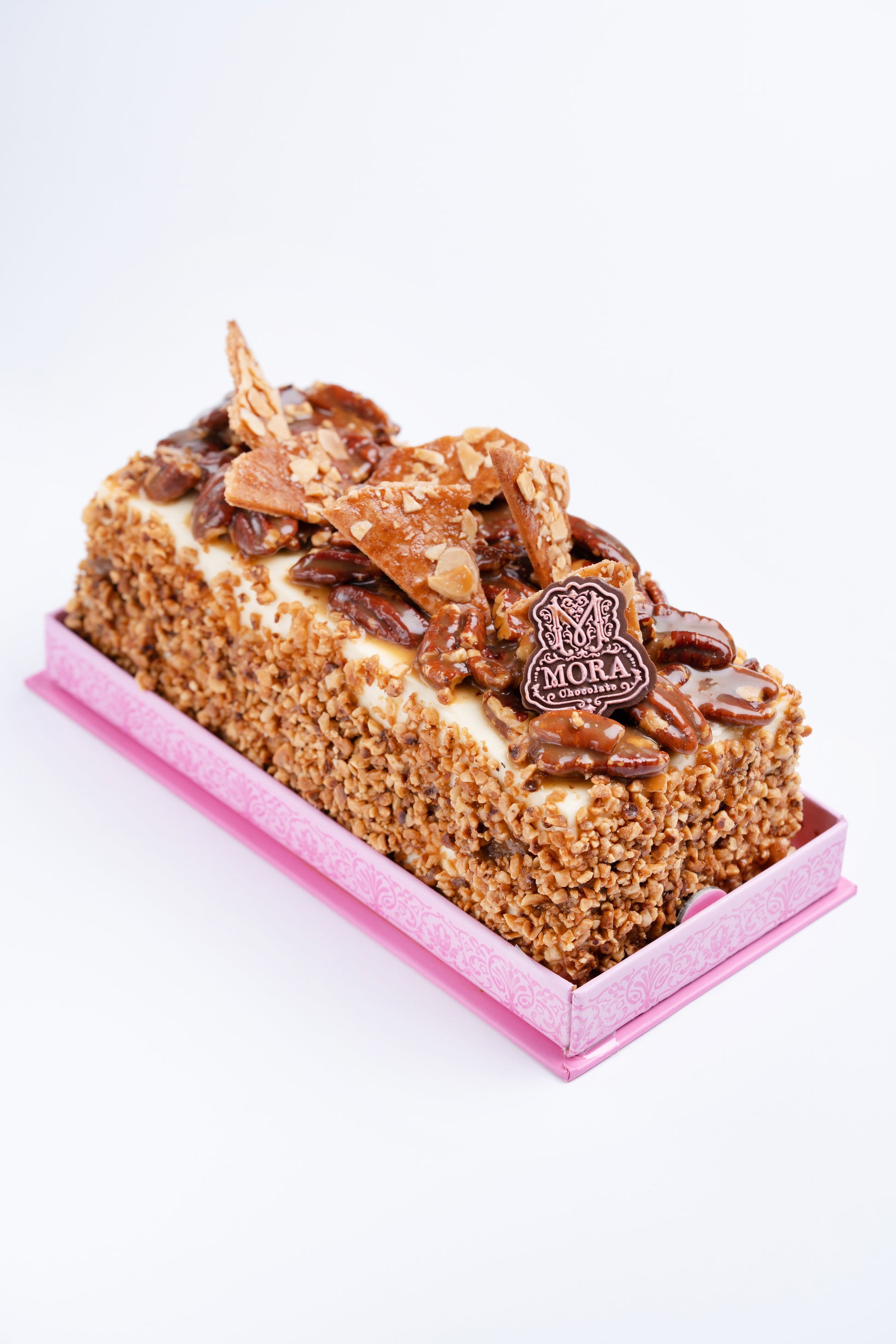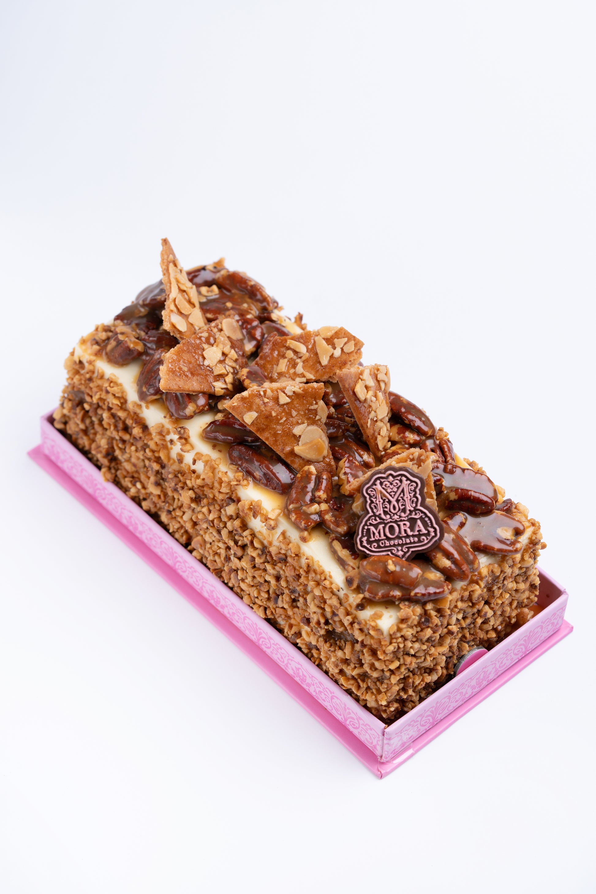 Biscuit digestive with cheesecake and caramel layers topped with pecan and Florentine biscuit .