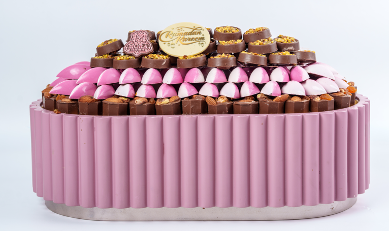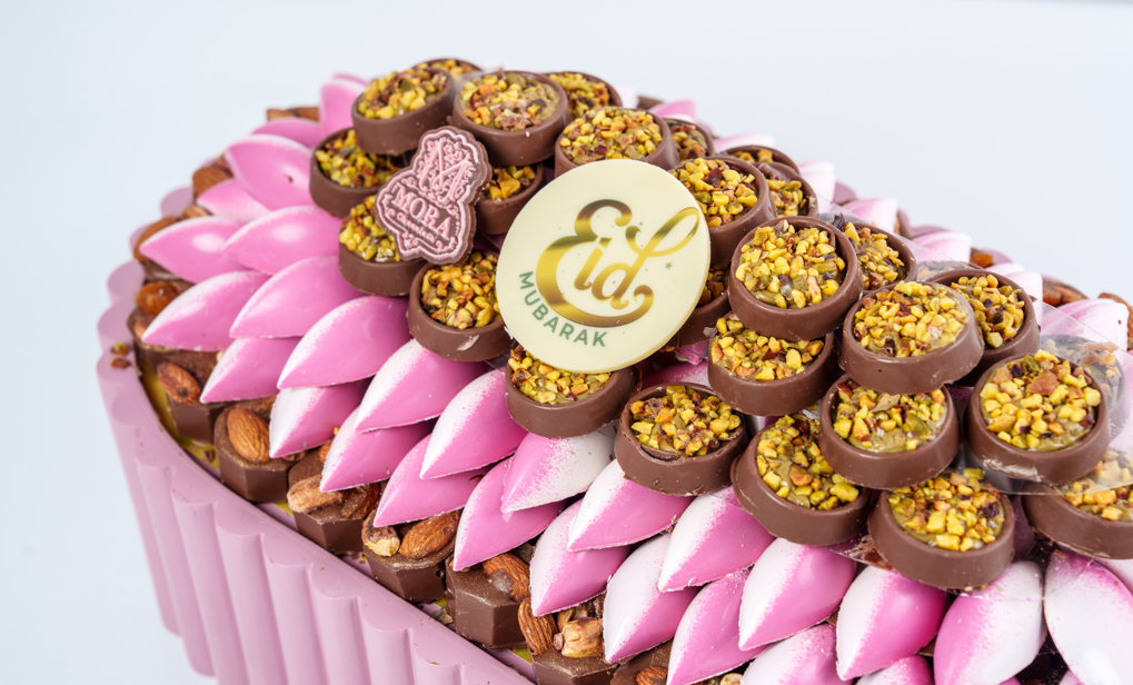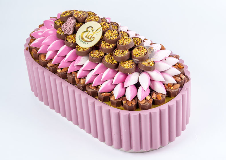 An elegant pink platter featuring a refined mix of gourmet mini sweets, chocolates, and mixed nuts, beautifully presented in a modern fluted container and finished with a gold Eid tag.